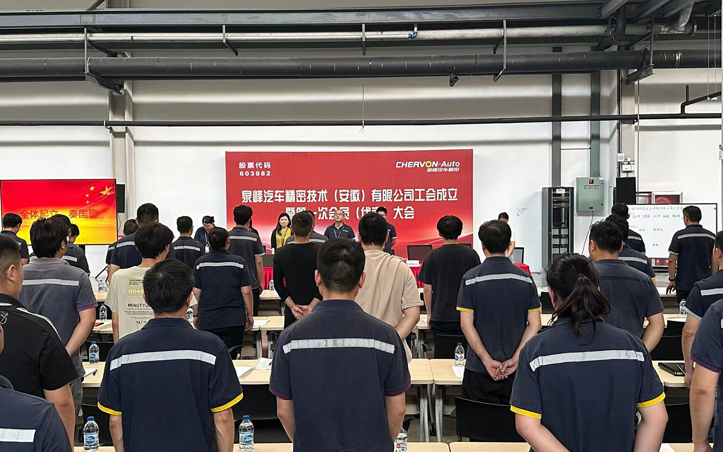 On the afternoon of August 11, 2023, the establishment of the trade union and the first member (representative) conference of Chervon Auto Precision Technology (Anhui) Co., Ltd. was successfully held in the machine workshop of the Maanshan plant, and 48 employee representatives and 17 non-voting representatives from various lines of the company attended the meeting.